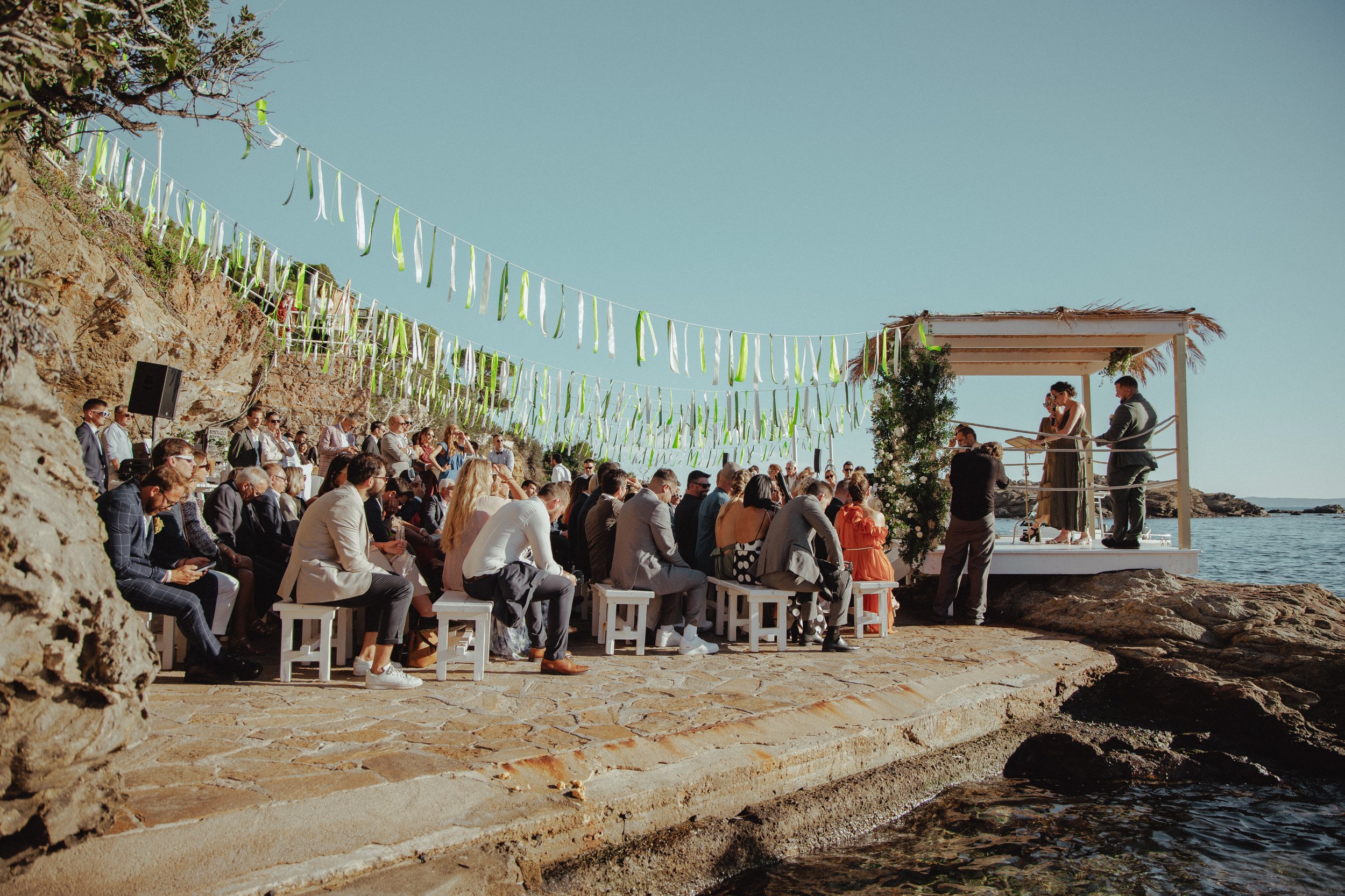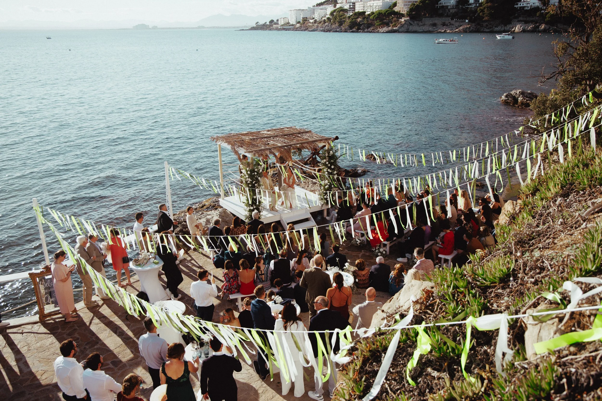 Et quel programme! La journée a été une suite successive de surprises pour les invités. Le rendez-vous était donné à l’hôtel. Le petit train de Roses les a emmené jusqu’au port, où deux sublimes bateaux les attendaient. Pas moi ns de 130 passagers à bord pour une ballade le long de la côte. Et là, cérémonie civile à bord, au large! Retour au port, puis petit train pour un retour à l’hôtel. La suite des festivités à continuer au bord de l’eau pour une magnifique cérémonie laïque au coucher du soleil.
